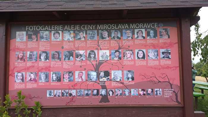 Nejdříve jsme navštívili Sedlnice, kde je vybudována Alej Ceny Miroslava Moravce. Zde, kromě tabule se známými dabéry, je třešňová alej, kterou vysázeli významní čeští herci. Ti, kteří už nejsou mezi námi, mají pod stromem památnou tabulku. Alej pokračuje k "domečku", který byl postaven před 10 lety na nalezených základech v dubu. Je věnován německy píšícímu slezskému básníkovi a spisovateli Josephu Von Eichenderffovi.